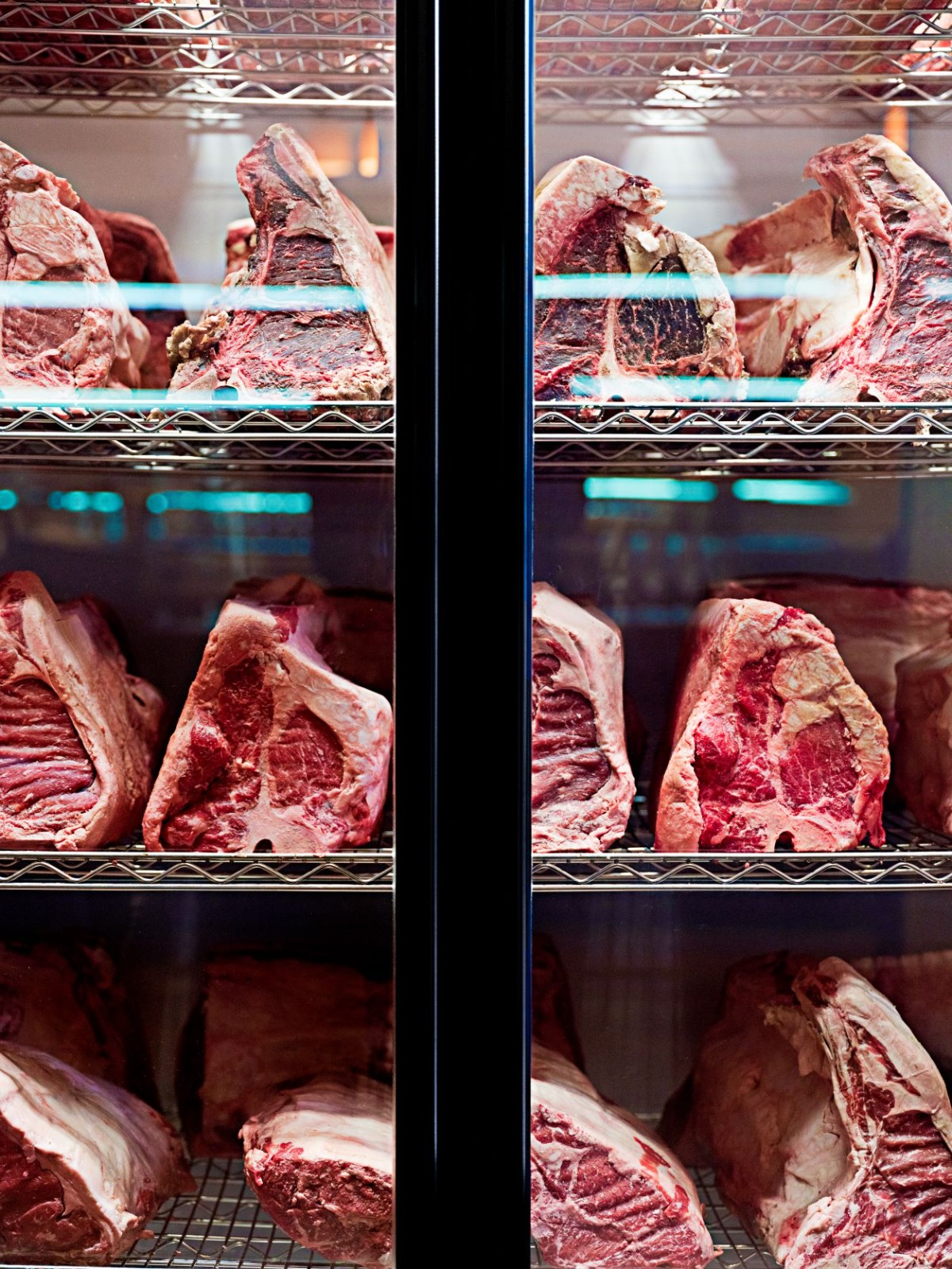 Since January 2013 we have dry aged all of our steaks in-house, in our cooler located in the lobby. Here you can see whole short loins and whole ribs as they age over 28 days.
